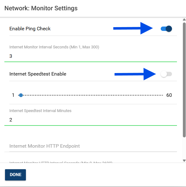 Within the network settings menu you can set enable and disable the Ping check, Speedtest and adjust the frequency or interval of these diagnostic tests being performed. We recommend the below: