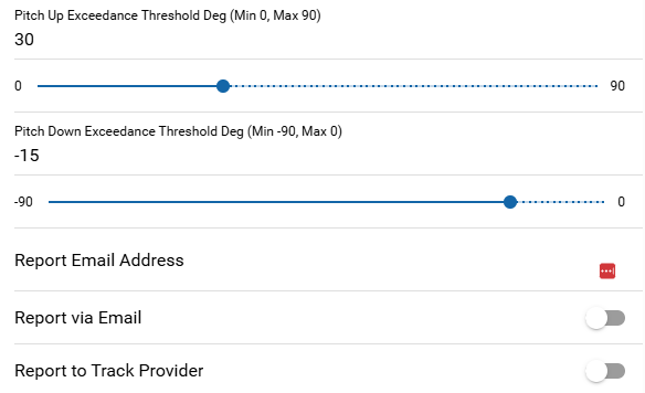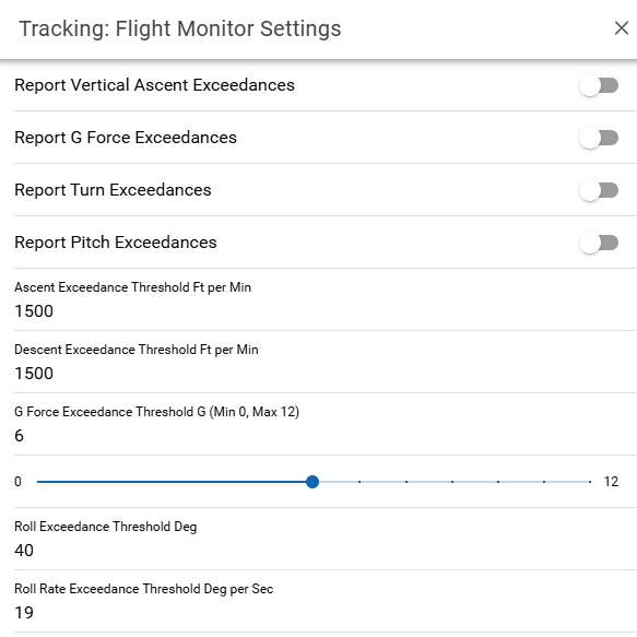 - Pitch Up Exceedance Threshold Deg = Set the minimum degrees of pitch up that will trigger an exceedance event.